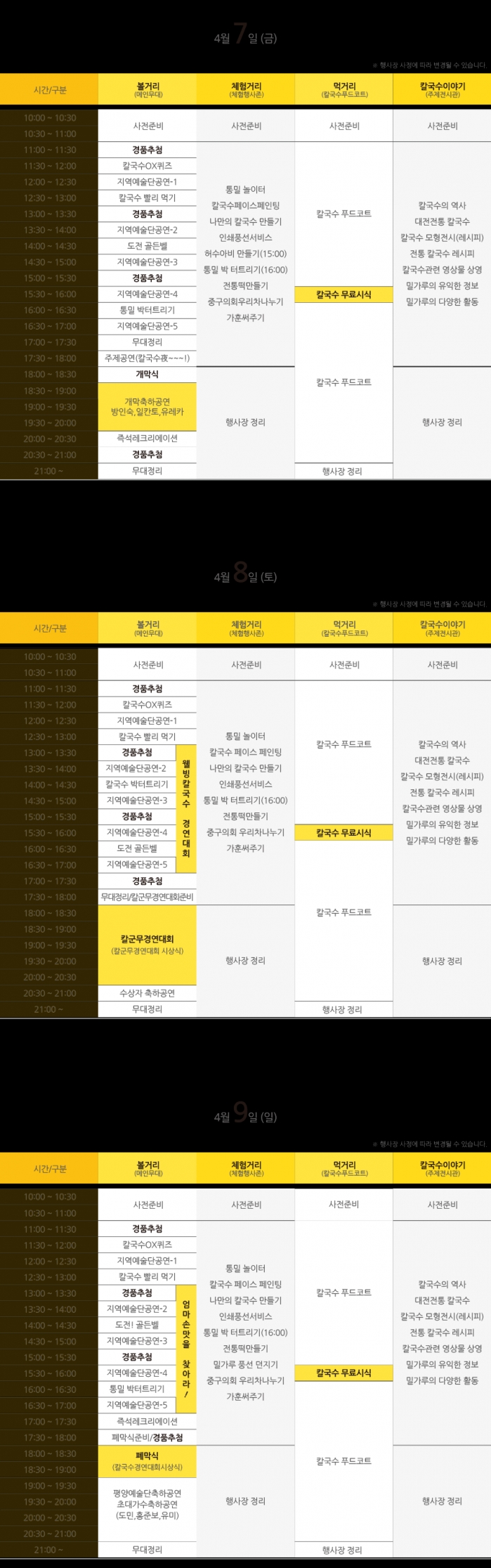 이와함께 웰빙칼국수 경연대회, 칼군무 경연대회, 칼국수 빨리먹기 대회, 칼국수 OX퀴즈·골든벨 등 다양한 볼거리와 그 시절 그 쇼, 인기가수 공연이 펼쳐진다.