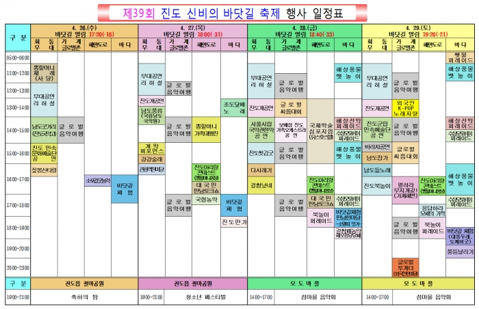 | 부대행사 | ○ 뽕할머니 가족 거리 퍼포먼스 ○ 해상선박 퍼레이드 ○ 천하장사와 씨름한판 ○ 진도 관광버스 투어 ○ 진도 전통 민속 주막 ○ 미라클 라이브 카페 ○ 진도아리랑 부르기 콘테스트 ○ 섬마을 음악회(모도) ○ 국제학술 심포지엄 ○ 진도 관광기념품 전시․판매 |