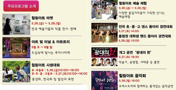 대표 프로그램 축제 주제(소재)와 부합된 핵심프로그램 | ㅇ힐링아트마켓 ㅇ힐링아트체험 | - 중견 및 신진작가가 참여하여 다양한 분야의 예술작품을 특별 제작한 부스에 전시 및 판매하여 관람객에게 예술 기회 제공 - 어린이층 외에 가족이 함께 즐길 수 있는 회화, 조소 등 다양한 분야의 예술체험 프로그램 확대 운영을 통한 방문객 만족도 충족 |
