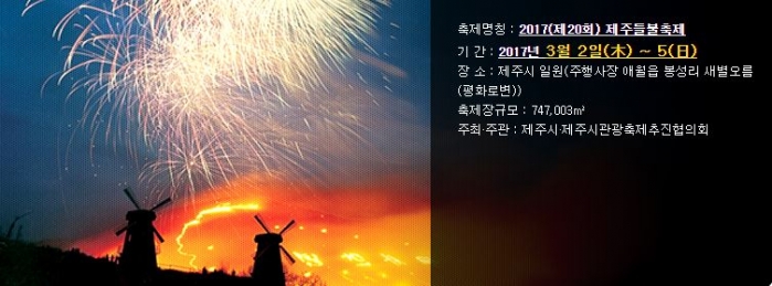 제주들불축제는 1997년 처음으로 개최하기 시작해 올해로 20회째 개최된다. 정월대보름을 전후해 개최되어 온 제주들불축제는 개최역사 20년 동안 2011년 구제역이 전국을 강타했던 해를 제외하고 매년 개최되고 있다.