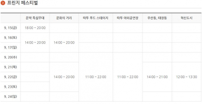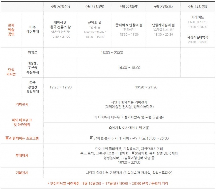 | 프린지 공연 | 100개팀 1,000명이 펼치는 문화예술공연 (장소 : 문화의 거리, 푸드스테이지, 태장동, 우산동, 미로예술시장, 따뚜소공연장) |
