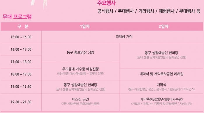 ❍ 주요내용 : 개막행사 및 초청공연, 우리동네 가수왕, 생활문화공연, 플리마켓, 부대행사 등