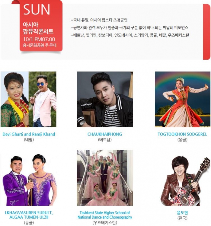 | 19:00~20:00 | 개막축하쇼 (성산아트홀 대극장) | 대한민국이주민가요제 (성산아트홀 대극장) | 아시아팝뮤직콘서트 (성산아트홀 대극장) | ||