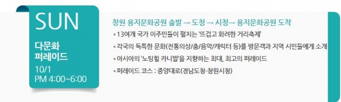 | 16:00~17:00 | 프린지콘서트4 (성산아트홀 야외무대) | 프린지콘서트8 (성산아트홀 야외무대) | 다문화퍼레이드 중앙대로 (경남도청-창원시청) | ||