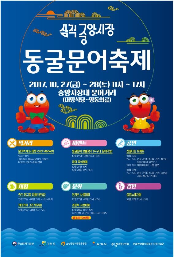 올해 처음으로 열리는「삼척중앙시장 동굴문어 축제」는 2017년 문화관광형 시장육성사업 및 전통시장 마케팅행사의 일환으로 문어를 활용한 축제를 개최하여 삼척중앙시장의 관광성을 부각시키고, 이를 통해 상인의 소득창출과 지역경제 활성화의 기틀을 마련하고자 기획되었다.