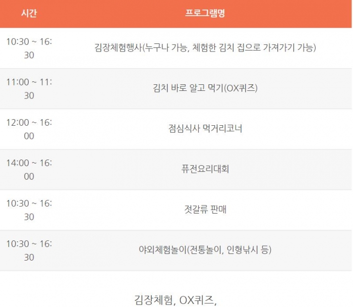 김치전 퓨전요리대회, 김치 바로 알고 먹기 OX퀴즈, 홀인원 골프, 인형낚시 등