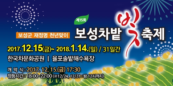 그 장엄한 천 년을 기리기 위하여 올해 "보성차밭 빛축제2017"은 "천년 보성, 천송이 빛으로 피어나다"라는 주제로, 보성군 한국차문화공원 및 율포솔밭해수욕장 일원에서 12월 15일부터 2018년 1월 14일까지 찬란한 빛과 아름다운 화합의 축제를 개최합니다.