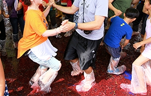 대형 세트장에서 신나는 음악에 맞춰 포도를 밟으며 춤추며 스트레스 날리는 체험 프로그램