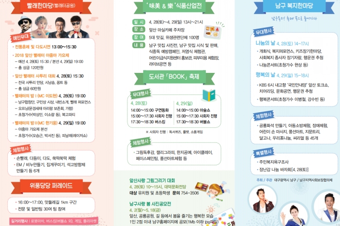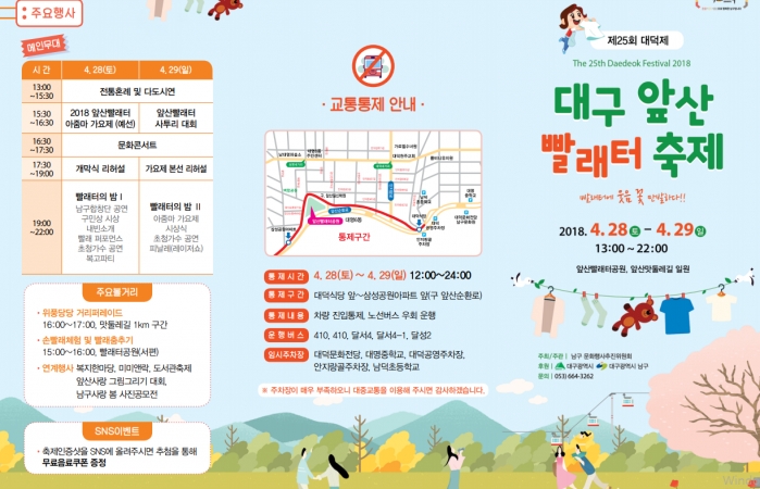 올해 대구 앞산빨래터 축제가 4월 28일(토)부터 4월 29일(일)까지 양일간 앞산빨래터공원 및 맛둘레길 일원에서 “빨래터에 웃음꽃 만발하다”는 슬로건 아래 개최된다. 2018 앞산빨래터 아줌마 가요제, 앞산빨래터 사투리 대회, 거리 퍼레이드, 손빨래체험, 빨래 퍼포먼스, 빨래터의 밤(인기가수 초청) 등 다양한 프로그램으로 향기로운 봄날을 가득 채운다. 또한 복지한마당, 미미앤락 식품산업전, 도서관축제, 앞산사랑 그림그리기 대회, 남구사랑 봄사진 공모전, KBS 전국노래자랑을 연계행사로 개최한다.