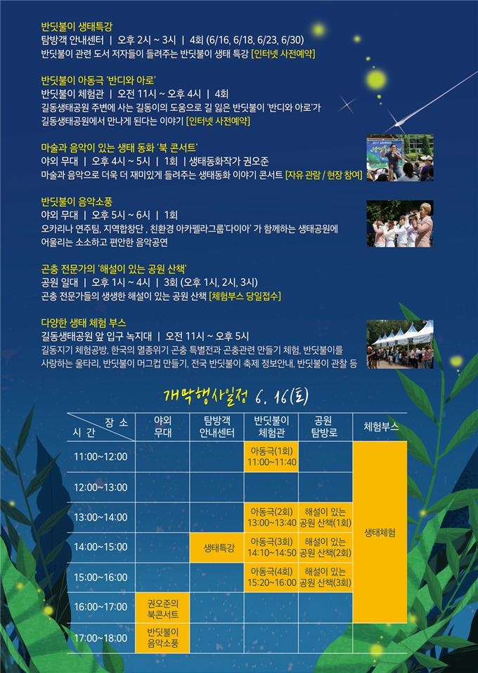 ○ 동화연극 ‘반디와 아로’ : 길동생태공원의 반딧불이를 주제로 한 아동극(사전예약)