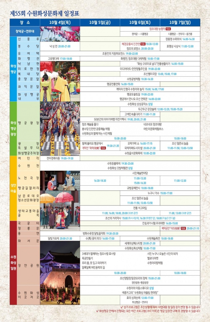 축제의 하이라이트인 정조대왕 능행차를 필두로 혜경궁 홍씨 진찬연 등의 재현행사, 그리고 수원천에서 아름답게 펼쳐지는 수원사랑등불축제 등