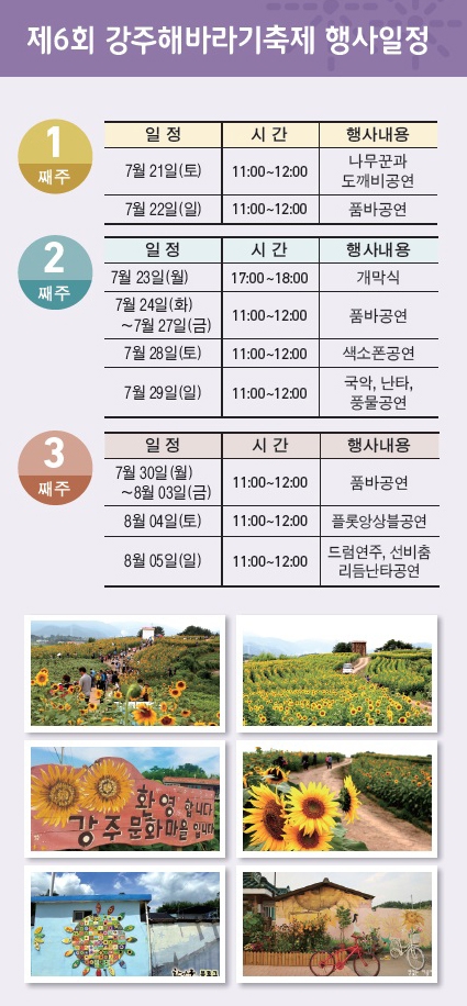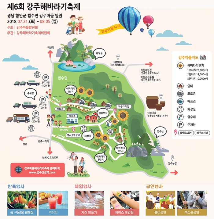 함안군 법수면 강주마을 주민들이 자체적으로 개최하는 해바라기 축제가 올해로 6회를 맞이합니다. 80,000㎡에 이르는 해바라기의 향연에 많이 와주세요