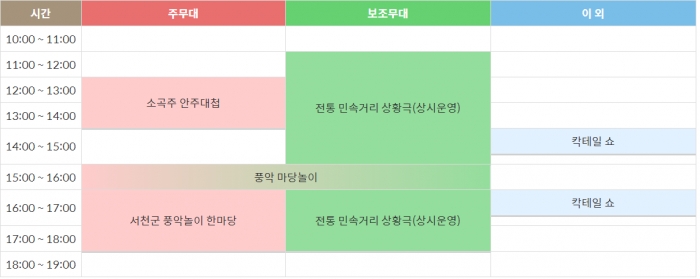 서천 풍악놀이 한마당, 풍악 마당놀이, 앉은뱅이 술 사수대회, 한산소곡주 체험, 소곡주 안주대첩