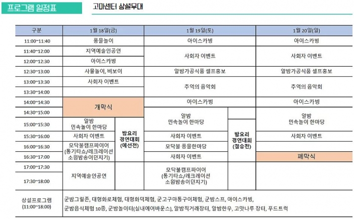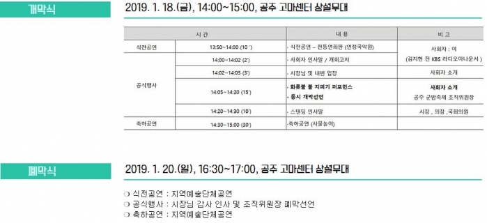 대부분의 겨울축제가 눈과 얼음을 활용한다면, "불"이라는 콘텐츠로 새로운 문화관광축제에 도전장을 내미는 이번 축제의 메인프로그램은 대형 화로체험과 공주군밤 그릴존 체험이다.