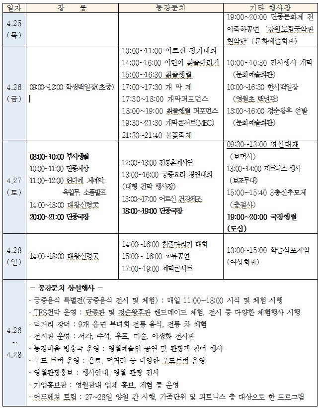 동강둔치, 세계유산 장릉 등 시내에서 야간 단종국장 재현, 단종제향, 부사행렬, 칡 줄다리기, 정순왕후 선발대회 등 대표 프로그램이 펼쳐진다. 27일 오후 6시부터 9시까지 국장 재현 행사가 진행되는데 이 것이 핵심 프로그램으로 관광객의 시선을 끌고있다. 올해 제 53회를 맞으며 대표적 문화축제로 발전하려는 시도로 메인행사인 단종국장은 야간 행렬로 변경되었다. 어린이칡줄다리기 행사도 기대가 된다. 거대 마리오네트의 장릉 상설전시 및 다양한 퍼포먼스도 인기를 끈다.