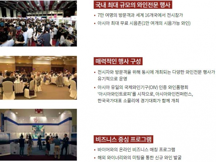 아시아 최대 규모의 와인 테이스팅존을 운영하며 이탈리아, 스페인, 프랑스, 독일 등 주요 와인 생산국들이 출품한 약 1만 여종의 와인들을 한자리에서 만나볼 수 있는 국내 유일의 와인전문박람회로서 일반 참관객에게는 각국의 문화와 와인을 접할 수 있는 절호의 기회가 될 것입니다. 특히, 와인 산업 종사자에게는 비즈니스 교류의 장으로서 국내 와인 유통 산업의 허브 역할을 수행할 것입니다. 금년 행사는 국제와인기구 OIV(International Organization of Vine and Wine)의 승인을 받는 세계 3대 와인 품평회 중 하나인 "아시아와인트로피"와 와인 전문가는 물론 와인 애호가가 참가하여 와인에 대한 폭넓은 지식을 접할 수 있는 "아시아와인컨퍼런스", "소믈리에 대회" 등의 연계행사와 세계 여러 나라의 음식을 각종 문화 공연과 함께 맛볼 수 있는 다채로운 부대행사도 마련됩니다.
