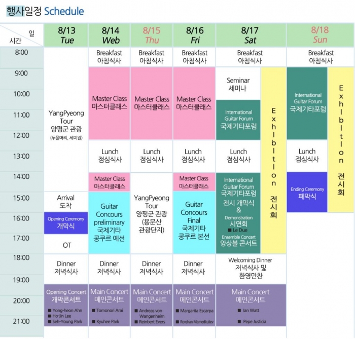 지난해 콩쿠르 입상자들의 개막콘서트를 시작으로 매일 저녁에는 쉬자파크 대강당(13~16일)과 양평군민회관(17일)에서 국내외 유명 기타연주자들의 메인 콘서트가 열려 양평군민과 참가자들에게 기타의 아름다운 선율을 들려줄 예정이다. 특별히 15일 라인베르트 에버스의 연주회에는 가일스트링콰르텟과 함께 한국에서 초연되는 곡들을 선보인다.