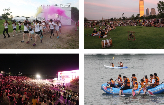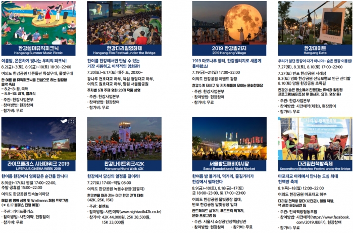 - 한강공원 여름축제의 대명사인 ‘한강몽땅 여름축제’는 7~8월 1달여간 11개 한강공원 전역에서 진행되는 여름축제로 80여개의 다양한 프로그램이 진행된다.