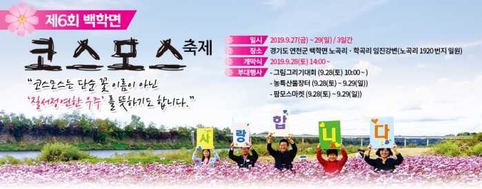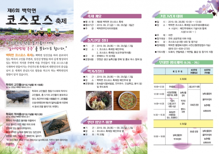 내용 : 코스모스 축제 기념식, 그림그리기대회, 농산물장터, 먹거리장터, 팜모스마켓 등