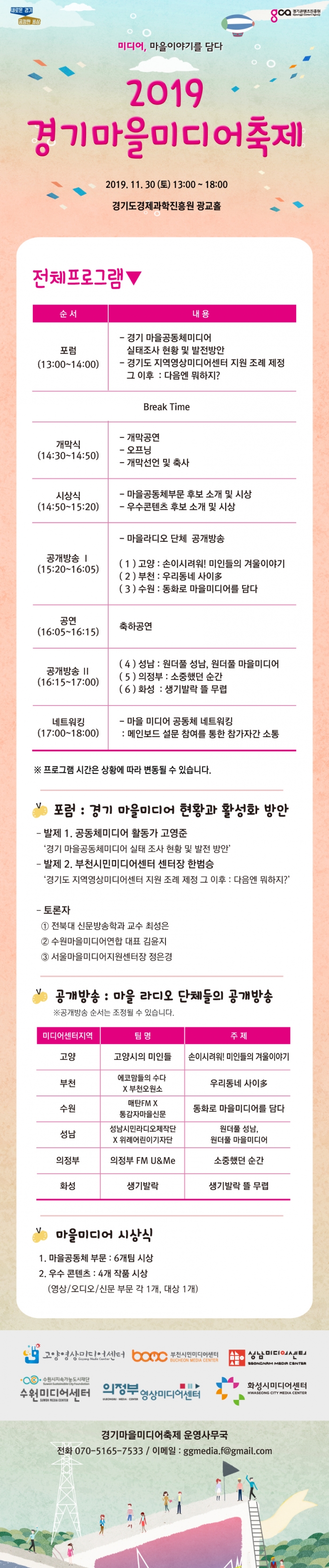 경기도와 경기콘텐츠진흥원은 11월 30일(토) 오후 1시부터 6시까지 경기도경제과학진흥원 광교홀에서 ‘경기마을미디어축제’를 개최한다. ‘경기마을미디어축제’는 ‘미디어, 마을이야기를 담다’를 주제로 마을미디어공동체와 미디어 콘텐츠 제작자들이 함께 즐기는 축제이다.