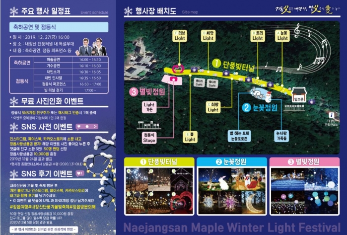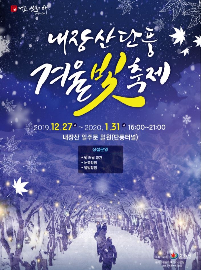 설경이 아름다운 내장산 단풍터널 일원(약 500m)에 은은하고 따사로운 LED 조명으로 단풍 빛 터널과 눈꽃정원, 별빛정원 등 환상적인 야경을 연출한다.