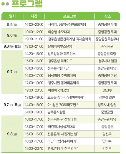 9월 5일부터 6일까지 2일간 중앙공원과 성안길 일원에서 시민축제 청주읍성큰잔치를 개최한다. 읍성퍼레이드에 더 많은 시민이 참여할 수 있도록 하고 청주읍성의 역사성을 고찰하기 위해 문화체험부스, 주제 전시, 강연도 준비하는 등 다양한 프로그램을 마련할 예정이다.