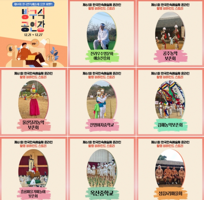 ‘제61회 한국민속예술제’는 12월 한 달간, 전통공연예술진흥재단 유튜브 채널과 네이버TV, 한국민속예술제 홈페이지(www.kfaf.or.kr)를 통해 관람할 수 있다.