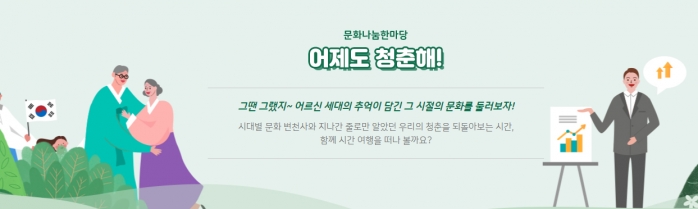 어제도 청춘해!에서는 어르신 세대의 유년 시절을 추억한다. △패션, 대중가요, 전통 놀이 등 시대별 문화 콘텐츠의 변천사를 소개하고 △가장 빛나는 순간의 사진 공모전과 전시 등을 진행한다.