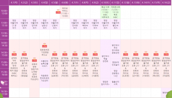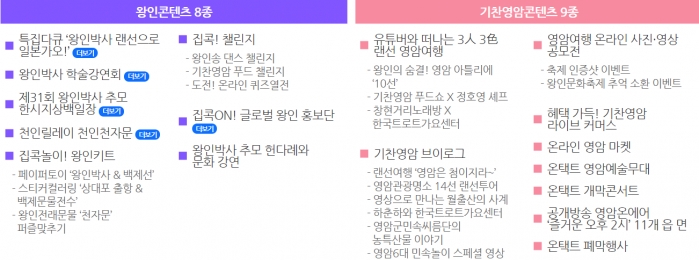 한편, 2021 온라인 영암왕인문화축제는 4월 1일부터 4월 16일까지 축제홈페이지(www.왕인문화축제.com), 유튜브 채널 (‘영암왕인TV’)을 통해 즐길 수 있으며, 대표 프로그램인 다큐 ‘왕인박사 랜선으로 일본가오!’, 집콕! 챌린지 등 2개 부문 17개 프로그램으로 다채롭게 진행할 계획이다.
