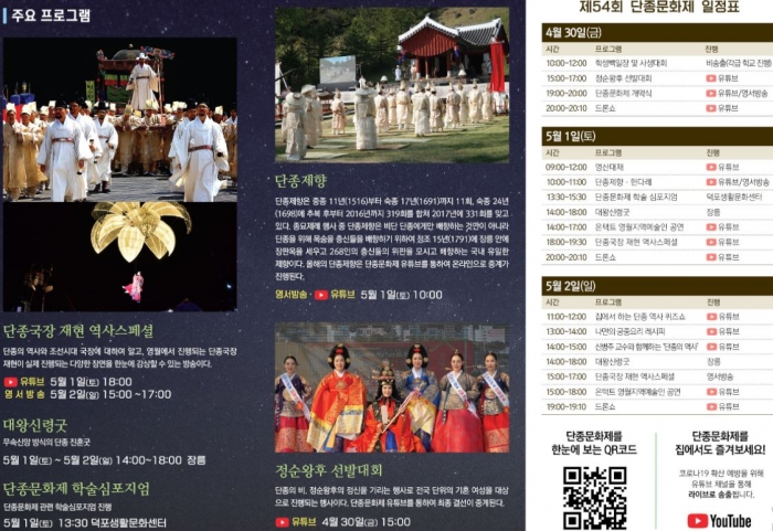 올해의 단종문화제는 단종 국장, 단종 제향, 한시백일장, 정순왕후 선발대회, 칡 줄 제작 등 다양한 행사를 온라인을 중심으로 비대면으로 시행하여 여러분에게 안전하면서도 즐겁고 그에 더하여 교육적인 경험을 제공하고자 합니다. 그 뿐 아니라 현장에서는 드라이브 인 형태로 개막퍼포먼스공연, 드론 쇼, 지역예술인공연 및 각종 행사의 온라인 영상송출에 이르기까지 다양한 행사가 진행됩니다.