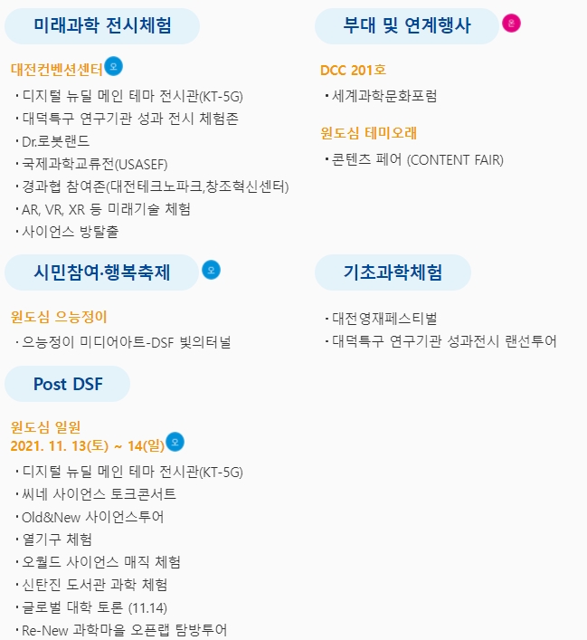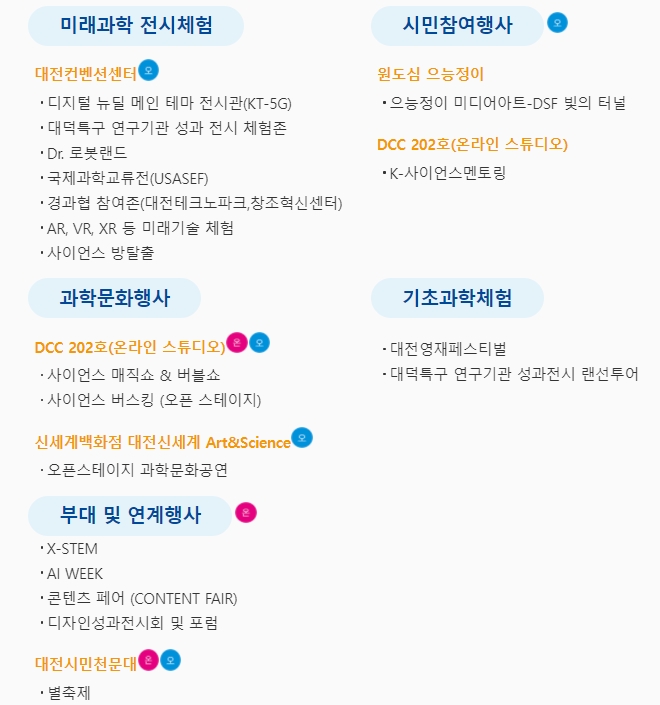 대전컨벤션센터 메인 전시관에서는 기업존, 대덕특구 오픈랩, 로봇, AR, VR, XR 등 미래과학을 체험할 수 있으며, 엑스포과학공원에서는 영재 페스티벌, WISET 과학놀이터와 같은 기초과학 체험존과 ETRI 자율주행버스를 탑승하고 갑천에서는 열기구도 체험할 수 있다.