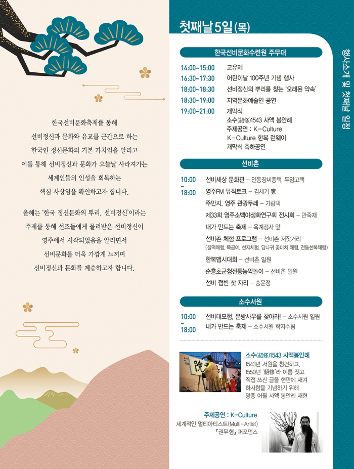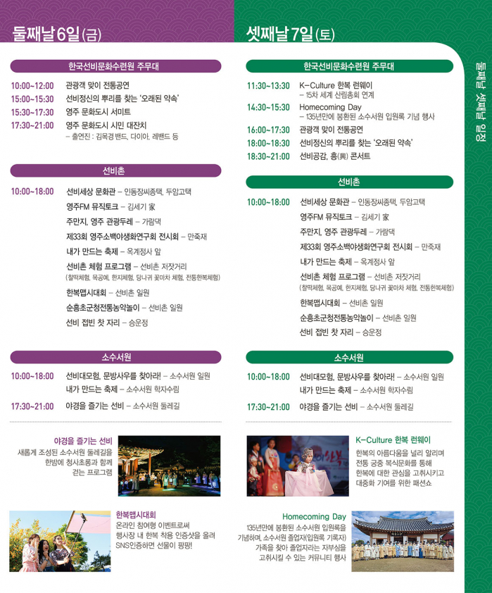 축제프로그램: △소수서원 졸업자 입원록 기록자 후손 찾기 △소수서원 사액 봉안례 재현 △K-컬처 한복런웨이 △선비세상 문화관 △야경을 즐기는 선비 △고유제 △한복맵시대회 △지역 문화예술공원 △어린이날 10주년 기념 퍼포먼스 △선비공감 흥 콘서트 등
