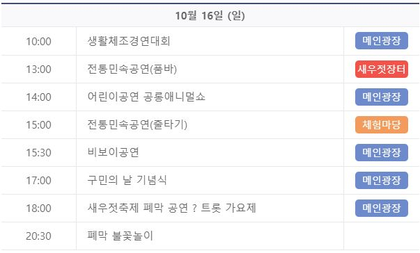 - 판매장터 : 새우젓판매ㆍ지역특산품판매ㆍ먹거리장터 운영