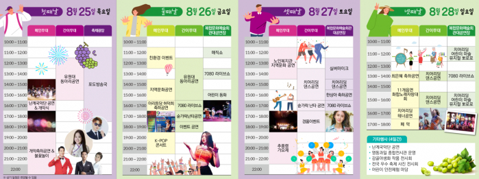 - 전국 최대의 재배면적(2,209ha)과 품질 좋은 포도를 전국에 알리기 위해 마련한 축제로 단순히 포도를 먹기만 하는 축제가 아니라 포도를 직접 따는 체험부터, 포도를 이용해서 와인, 빙수,초콜릿 등 여러 가지 제품을 만들고, 오감을 만족시킬 수 있는 포도밟기 등 수십 가지의 다양한 체험들이 함께하는 즐거운 축제의 장