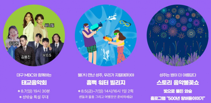 태그성주축제별뫼줄다리기성밖숲잔디광장태교음악회흠뻑 워터빌리지500년 왕버들드림페스티벌세종대왕자태실
