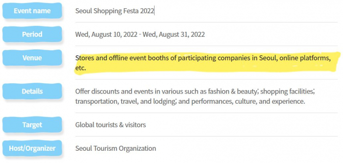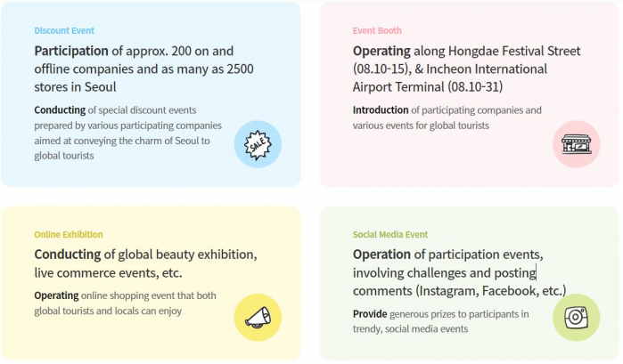 Seoul Shopping Festa the biggest tourism sales festival in Seoul where companies from various industries, such as fashion & beauty; shopping facilities; transportation, travel, and lodging; and performances, culture, and experience, participate and offer discounts and events.