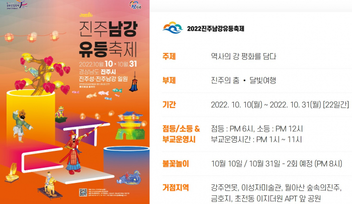 드론 라이트쇼, 미디어아트 ‘GALAXY쇼’, 소망등(燈) 달기 체험, 소형등(燈) 만들기 체험, 유등 만들어 띄우기 체험, 시민참여 등(燈) 만들기 체험, 스탬프 & 트레져 투어, 대한민국 등(燈) 공모 대전출품작 전시, 유람선으로 아름다운 등(燈) 관람체험, 남가람 어울마당, 버스킹 공연, DJ와 함께 하는 추억의 음악다방, 아트조명길 축등(燈) 설치, 전국사진촬영대회, 진주음식큰잔치 및 농·특산품 판매코너, 거점지역 등 전시, 사랑다리 건너기 체험, 유등과 함께 하는 시인들