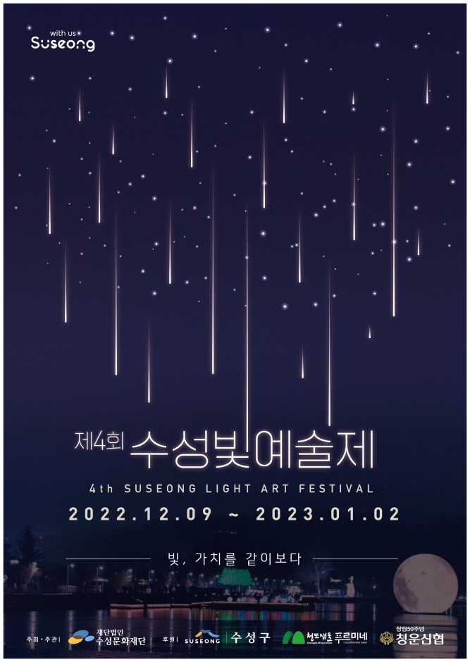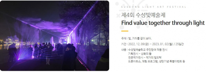 12월9일(금)점등 및 드론아트쇼를 시작으로 25일간 수성빛예술학교 작품 전시 및 전문작가 빛조형물 전시, 시인 이상화를 기리는 기획전시 등이 진행되며 12월24일 드론아트쇼와 뱅쇼, 어묵나눔과 다양한 주민체험 프로그램이 열린다.