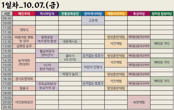 제20회 서산해미읍성축제로 여러분을 초대합니다!서산해미읍성축제는 방문객 모두가 나이와 성별, 국적과 인종을 불문하고 서산해미읍성이 품어온 축성 600년의 역사와 우리나라의 고유한 전통·문화적 가치를 고스란히 이해하고 즐길 수 있도록 다양한 프로그램을 통해 이를 풀어내고자 합니다.