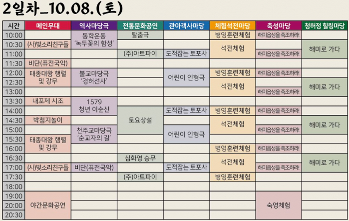 태종대왕 행렬 및 강무(講武)재현, 역사마당극, 저잣거리 마당, 옥사체험, 숙영체험 등 기존에 인기를 끌었던 프로그램뿐만 아니라, 금년도 제20회 축제를 맞아 새롭게 선보일 다채로운 신규프로그램을 통해 그동안 코로나-19로 인해 답답했던 일상에서 벗어나 서산해미읍성 축성600년의 역사를 몸으로 직접 느끼고 배우는 즐거움을 여러분께 선사하고자 합니다.
