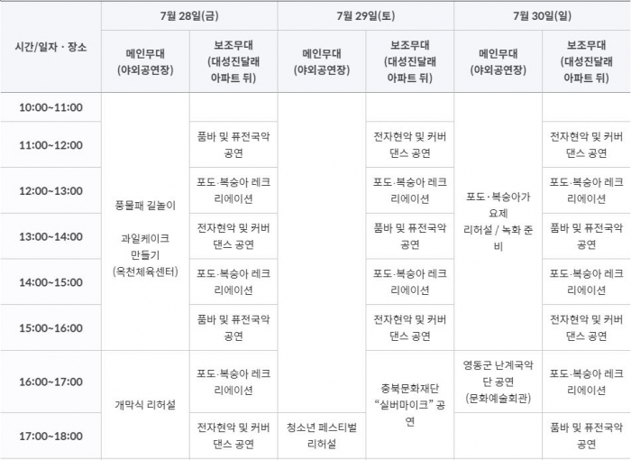 - 공연행사: 개막 축하음악회, 청소년 페스티벌, 포도·복숭아 가요제 등