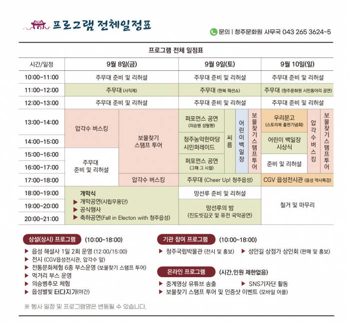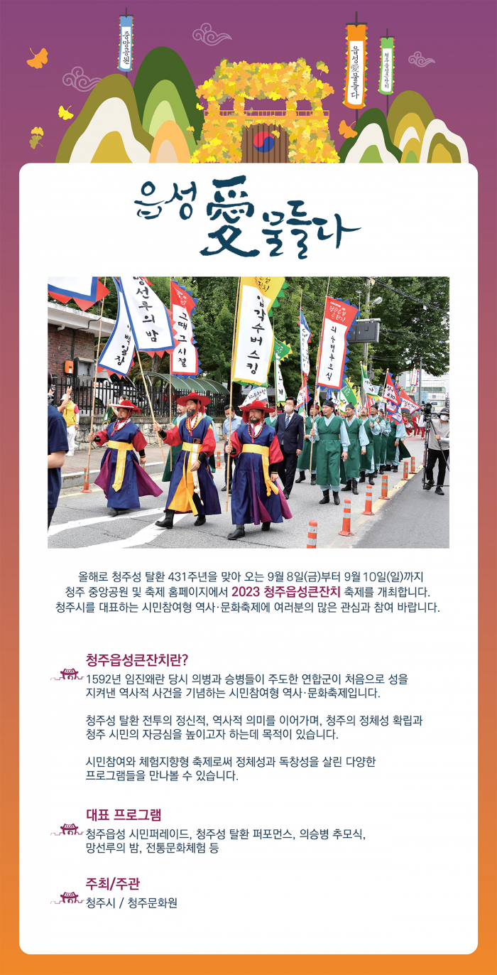 청주읍성 시민퍼레이드, 청주성탈환 퍼포먼스, 의승병 추모식, 망선루의 밤, 전통문화체험 등