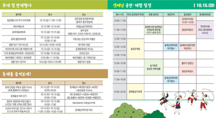 개막공연(불꽃쇼), 나도 모르게 어깨가 들썩, 전통 줄타기, 동래부사 집무재현 마당극, 조선의 이야기꾼 전기수가 떴다, 도사 전우치 마술버스킹, 슬기로운 읍성민 체육생활, 읍성민 솜씨자랑 등