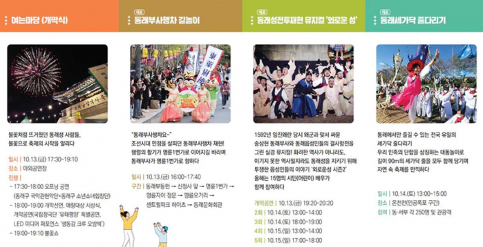 1592년 임진왜란 당시 동래성을 지키기 위해 송상현 동래부사와 동래읍성민들이 일치단결하여 결사 항전하던 역사적 배경을 토대로 실전의 긴박한 전투 상황을 재현하고 읍성민들의 장터 등 생활상을 직접 체험케 하는 역사 체험형 축제