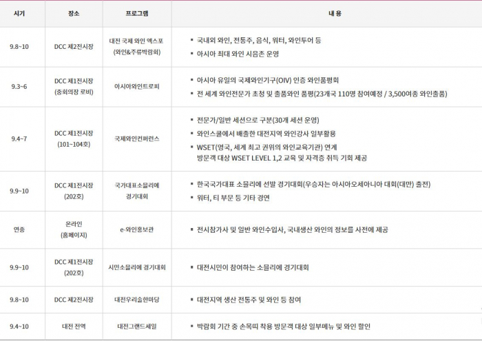 아시아 최대 규모의 와인 테이스팅존을 운영하며 이탈리아, 스페인, 프랑스, 독일 등 주요 와인 생산국들이 출품한 약 1만 여종의 와인들을 한자리에서 만나볼 수 있는 국내 유일의 와인전문박람회로서 일반 참관객에게는 각국의 문화와 와인을 접할 수 있는 절호의 기회가 될 것입니다. 특히, 와인 산업 종사자에게는 비즈니스 교류의 장으로서 국내 와인 유통 산업의 허브 역할을 수행할 것입니다. 금년 행사는 국제와인기구 OIV(International Organization of Vine and Wine)의 승인을 받는 세계 3대 와인 품평회 중 하나인 "아시아와인트로피"와 와인 전문가는 물론 와인 애호가가 참가하여 와인에 대한 폭넓은 지식을 접할 수 있는 "아시아와인컨퍼런스", "소믈리에 대회" 등의 연계행사와 세계 여러 나라의 음식을 각종 문화 공연과 함께 맛볼 수 있는 다채로운 부대행사도 마련됩니다.