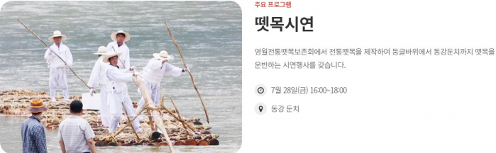 영월군은 1960년대까지 남한강 상류지역 주민들의 생활수단이자 교통수단이었던 옛날 전통방식의 뗏목문화를 계승하고자 1997년부터 ‘동강뗏목축제’를 개최하고 있습니다.