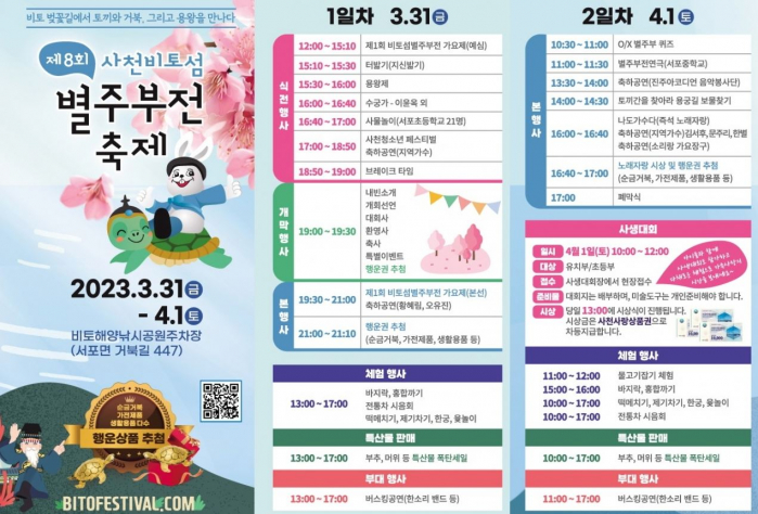 사천비토섬별주부전축제는 비토섬에 전해져 내려오는 별주부전의 전설과 아름다운 비경을 대·내외 홍보하고 주민들의 애향심과 자긍심을 고취하는데 목적이 있으며, 지역 문예인들의 발표의 장 제공을 통하여 향토문예 전승자 역할은 물론 용궁 퍼레이드, 지역특산물 판매장, 다문화 가족 특화음식코너 등 다양한 행사 및 장터를 통해 지역민과 방문객이 함께 어우러져 친목과 화합의 장을 마련하는 축제입니다.