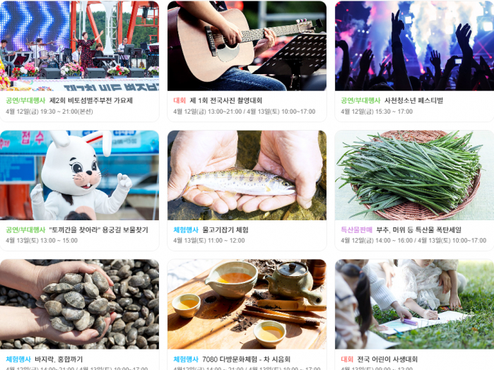용왕제, 터밟기, 사물놀이, 판소리 수궁가 발표회, 청소년페스티벌, 지역가수 축하공연과 특산물판매 행사