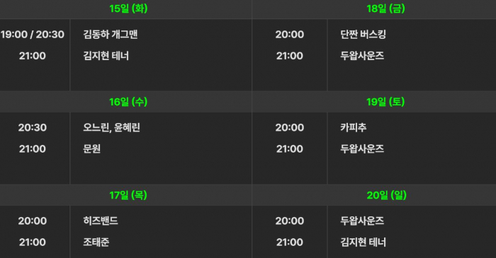 이번 행사에는 인기 유튜버 ‘카피추’가 8월 19일(토) 저녁 8시 공연자로 방문한다. 관람객은 ‘표절 허무송’이라는 신선한 장르의 공연을 무료로 즐길 수 있다. 8월 15일(화) 저녁 7시에는 유튜브 채널 ‘동하하’에서 활약하고 있는 개그맨 ‘김동하’가 재치 있는 입담을 들고 찾아올 예정이다. 8월 20일(일) 저녁 8시에는 유명 뮤지션 ‘두왑사운즈’가 방문하는 등 다양한 공연팀이 야외 행사를 풍성하게 꾸려나갈 예정이다.