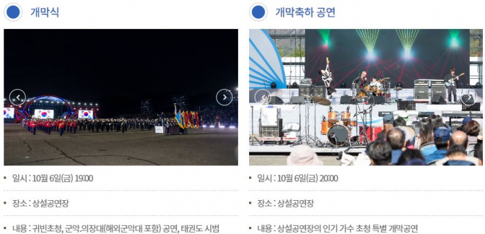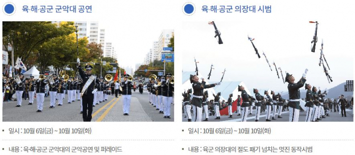 공연·경연: 군악·의장대, 해외 군악대 초청, 태권도, 군사경찰 모터 싸이카, 어린이 군복 패션쇼, 로드 퍼레이드, 드론봇 경연대회, 시민예술단체 공연, 어린이 군가 부르기